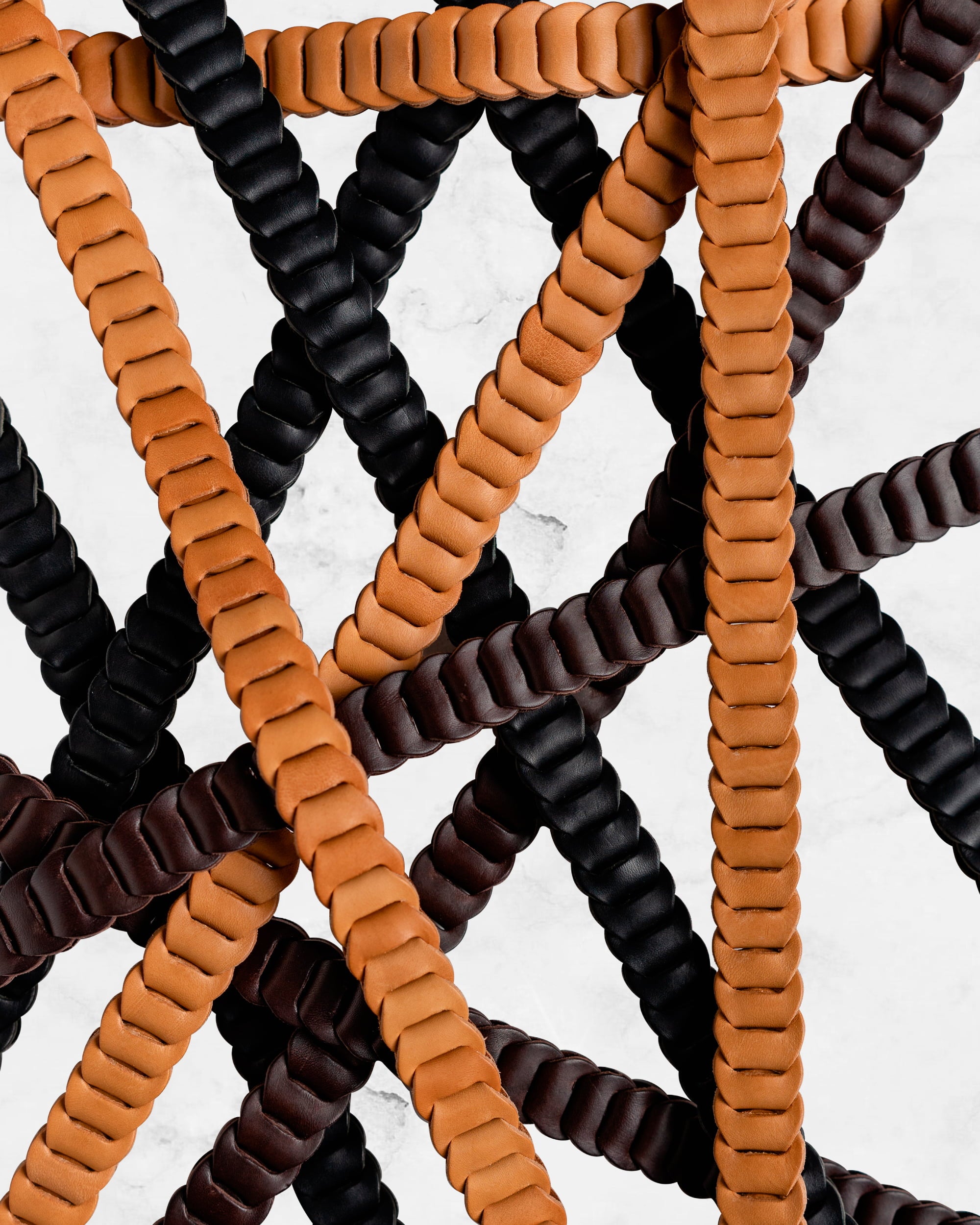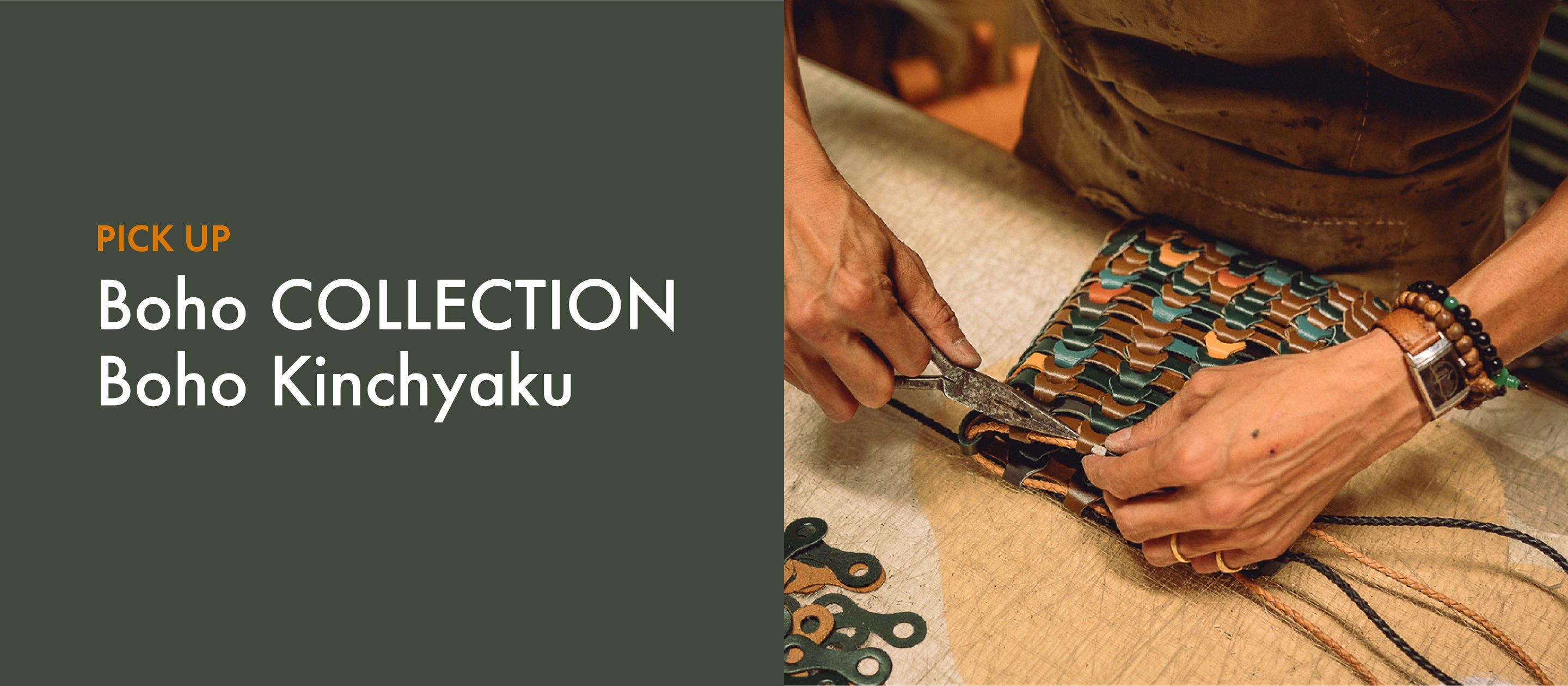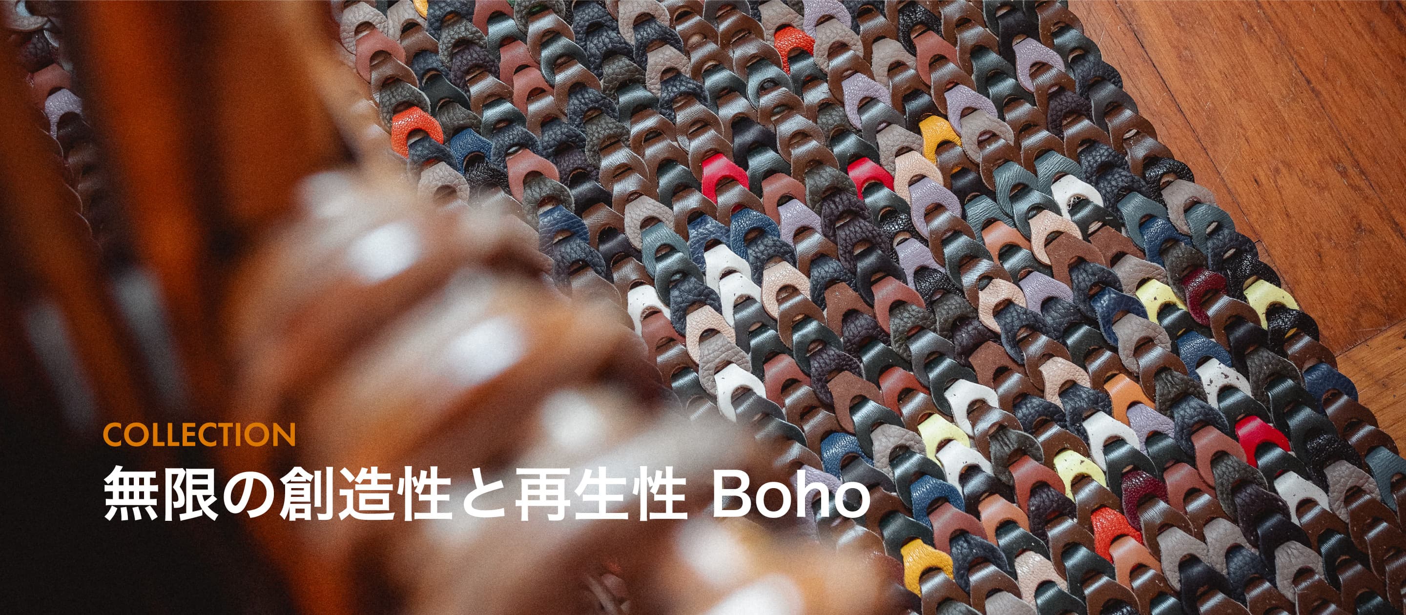 il micioを代表するコレクションとして、巾着からベルト、バッグに至るまで……さまざまなクリエーションを生み出し続けるBohoコレクション。小さなレザーピースを糊やミシンを使うことなく、職人の手仕事だけで編み上げていきます。