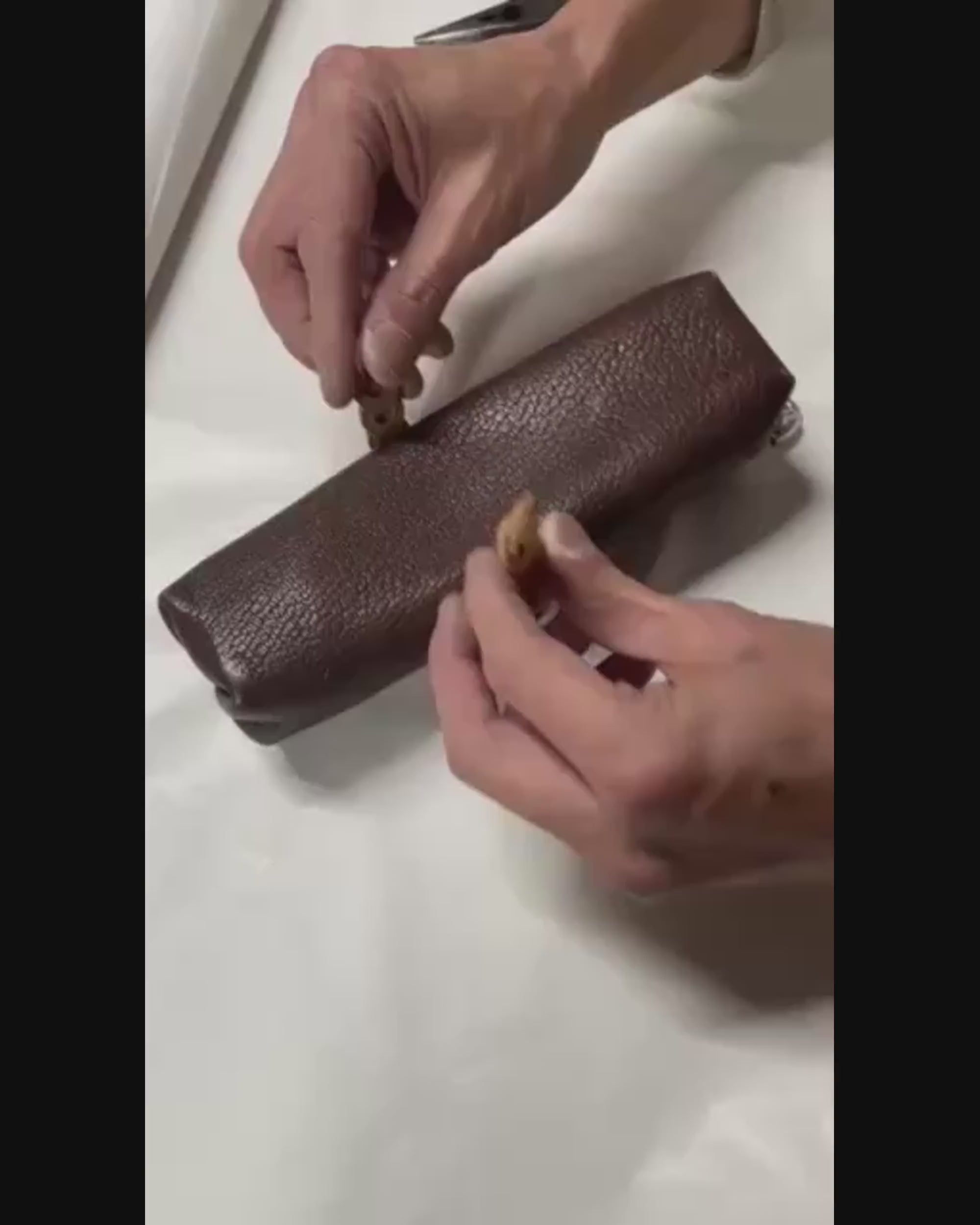 着脱方法については、本ページ内の動画をご確認ください。切り込みのある端のピースに、リベットのついたもう片方のピースを通してお使いください。最初は通しにくい場合がありますが、使用するうちに革が柔らかくなり、次第に通しやすくなります。