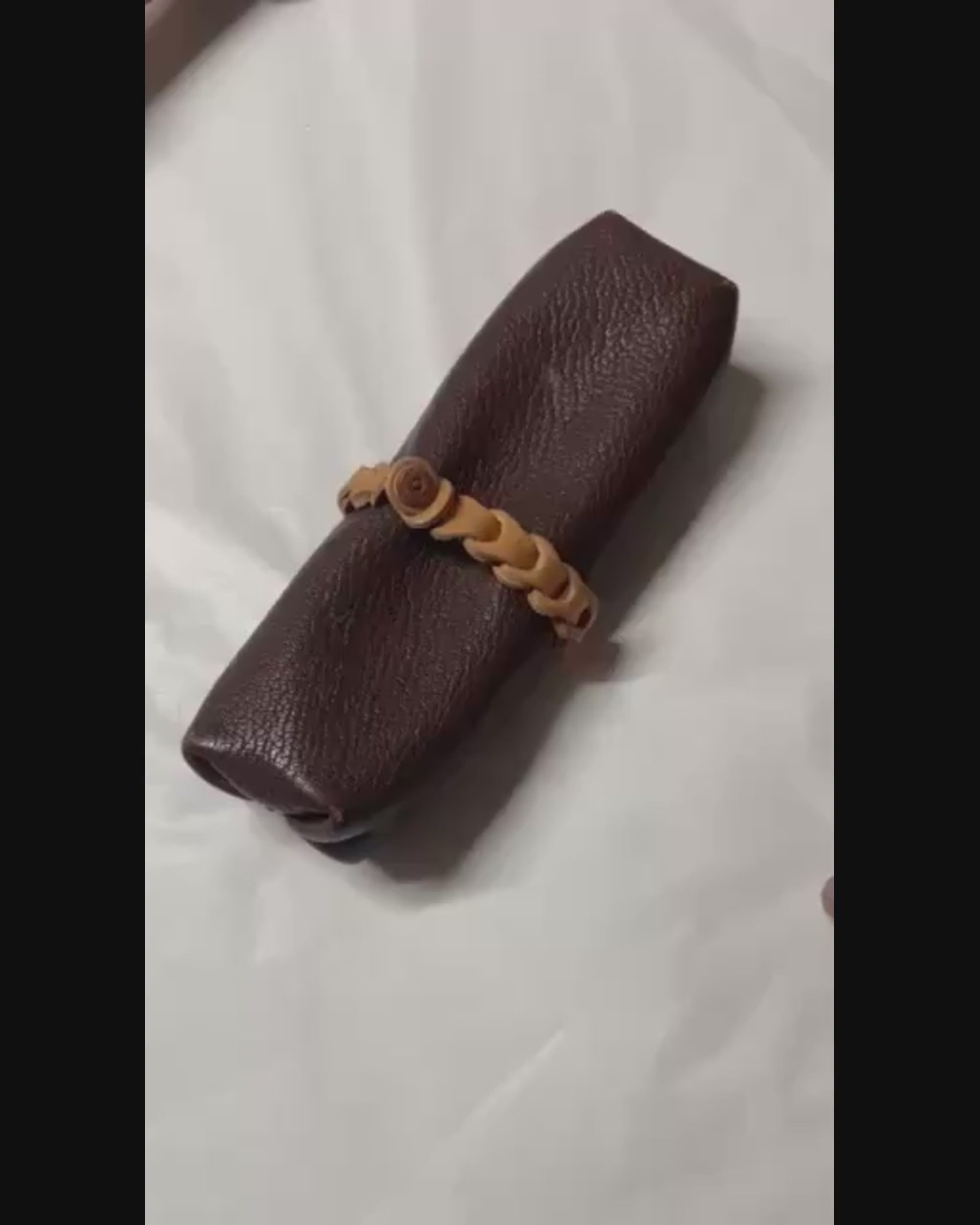 着脱方法については、本ページ内の動画をご確認ください。切り込みのある端のピースに、リベットのついたもう片方のピースを通してお使いください。最初は通しにくい場合がありますが、使用するうちに革が柔らかくなり、次第に通しやすくなります。